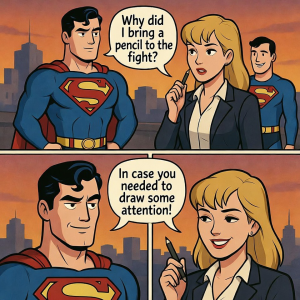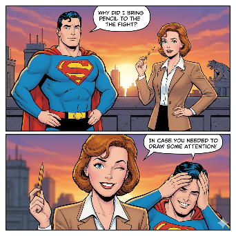 3-panel comic strip set in the DC Universe. Panel 1: Superman stands heroically on a rooftop at sunset, fists on hips, wearing his classic red and blue suit with the "S" emblem. Raising one eyebrow with a skeptical but amused expression. Lois Lane stands nearby, wearing a professional reporter outfit (blazer, blouse, pencil skirt), looking confident but slightly confused. Lois touch her lips with a tip of a pen in her hand. Panel 2: Superman looking in the Lois eyes. Superman speech bubble: “Why did I bring a pencil to the fight?”. Lois Lane and Superman glancing at each other in a moment of silence. Panel 3: Close-up of Lois Lane grinning proudly. He winks and holds up the pencil like a mic drop moment. Lois speech bubble: “In case you needed to draw some attention!”. Superman facepalms in the background, smiling despite herself. Style: Bright, comic-book illustration reminiscent of DC Comics—bold outlines, vibrant colors, dynamic angles. Include word balloons with clear, readable comic font. Keep the humor lighthearted and on-brand for DC’s tone.
