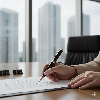 ultra-realistic professional corporate photography, close-up shot of a woman’s right hand signing a legal document on a polished wooden office desk, elegant black fountain pen with gold accents held delicately between fingers, soft pink manicured nails, subtle natural skin texture, diamond solitaire ring on ring finger with gold band, shallow depth of field