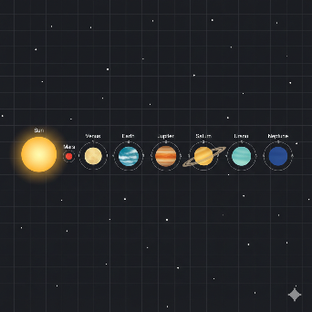 Orbit paths: subtle thin circular lines behind each planet, evenly spaced, labeled with orbital numbers or distances if possible.