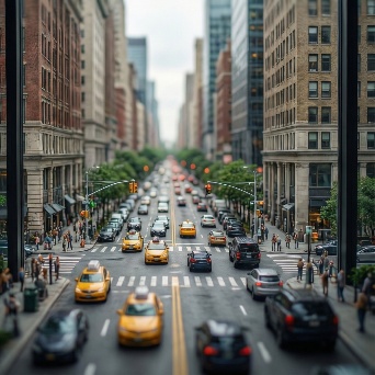 tilt shift photo of busy city street from the office window. makes real world appears tiny