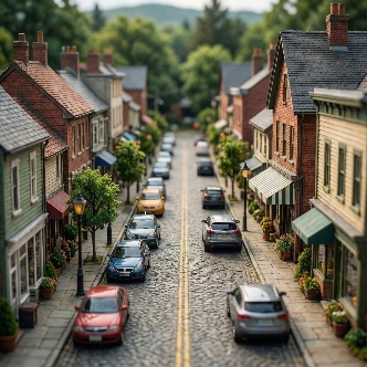 tilt shift photo of small town street.