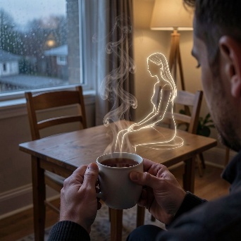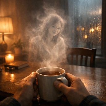 steam rises from the cup and slowly shapes into the ghostly outline of his girlfriend sitting across from him