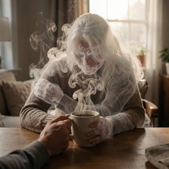 the steam subtly forms the delicate silhouette of a woman sitting across the table, made from thin swirling vapor, her outline gentle and incomplete, like a memory