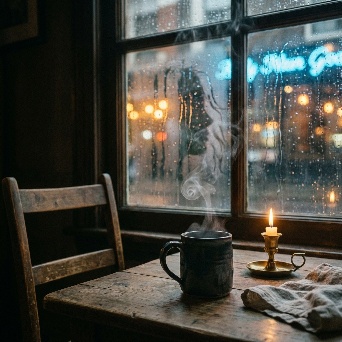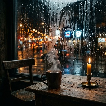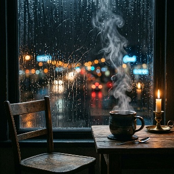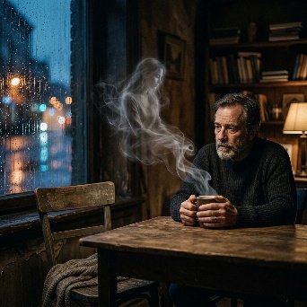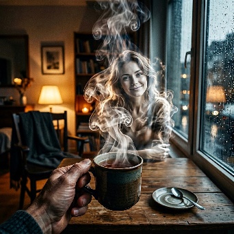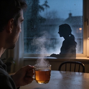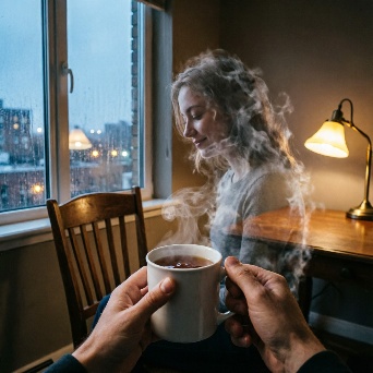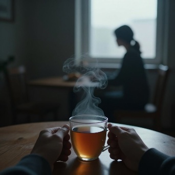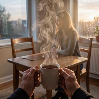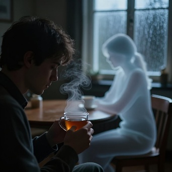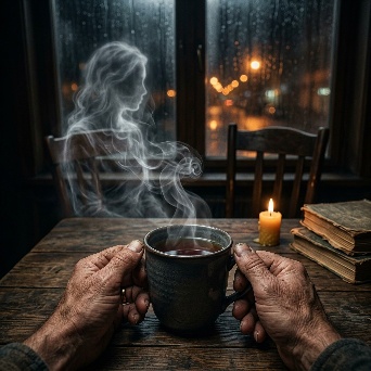 A hyper-realistic first-person POV (POV-shot) of a man’s weathered hands cradling a steaming ceramic mug on a dark oak table. The focal point is the rising tea vapor, which through natural pareidolia, subtly forms the faint, shimmering silhouette of a woman sitting in the empty wooden chair opposite him. The figure is an ephemeral suggestion, translucent and made entirely of swirling white mist. Background: a window blurred by heavy rain and the amber bokeh of city streetlights. A single beeswax candle flickers next to a stack of old, linen-bound books. Cinematic lighting, melancholic mood, 35mm film grain, poetic realism, 8k resolution, highly detailed textures.A cinematic, melancholic still of a lonely evening. A man sits in a dimly lit room, his hands wrapped around a hot cup of tea for warmth. Across from him, an empty chair. In the rising steam, the lingering memory of a loved one is captured in a delicate, ghostly wisp of vapor—a soft outline of a seated woman, nearly invisible. The lighting is low-key and intimate, with deep shadows. Rain streaks the windowpane, refracting the blue-hour city lights into shimmering tears. The atmosphere is heavy with "Saudade" (longing for something lost). Soft focus, muted earthy tones, volumetric shadows, shot on Kodak Portra 400.