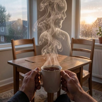 steam rising from the tea forms the delicate silhouette of a woman sitting in the empty chair across the table
