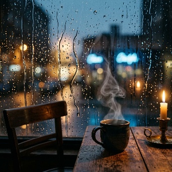 Moody atmospheric lighting, filmic grain, highly detailed water on glass, natural steam rising from the mug. Cinematic composition, melancholic mood, cozy interior contrasted with rainy evening outside. An empty wooden chair sits to the left of the table. A lit candle in a brass holder rests on the right side of the table.  NO actual face, just a pareidolia effect of some seems to be random phenomena coincidently form a subtle outline resemble woman profile