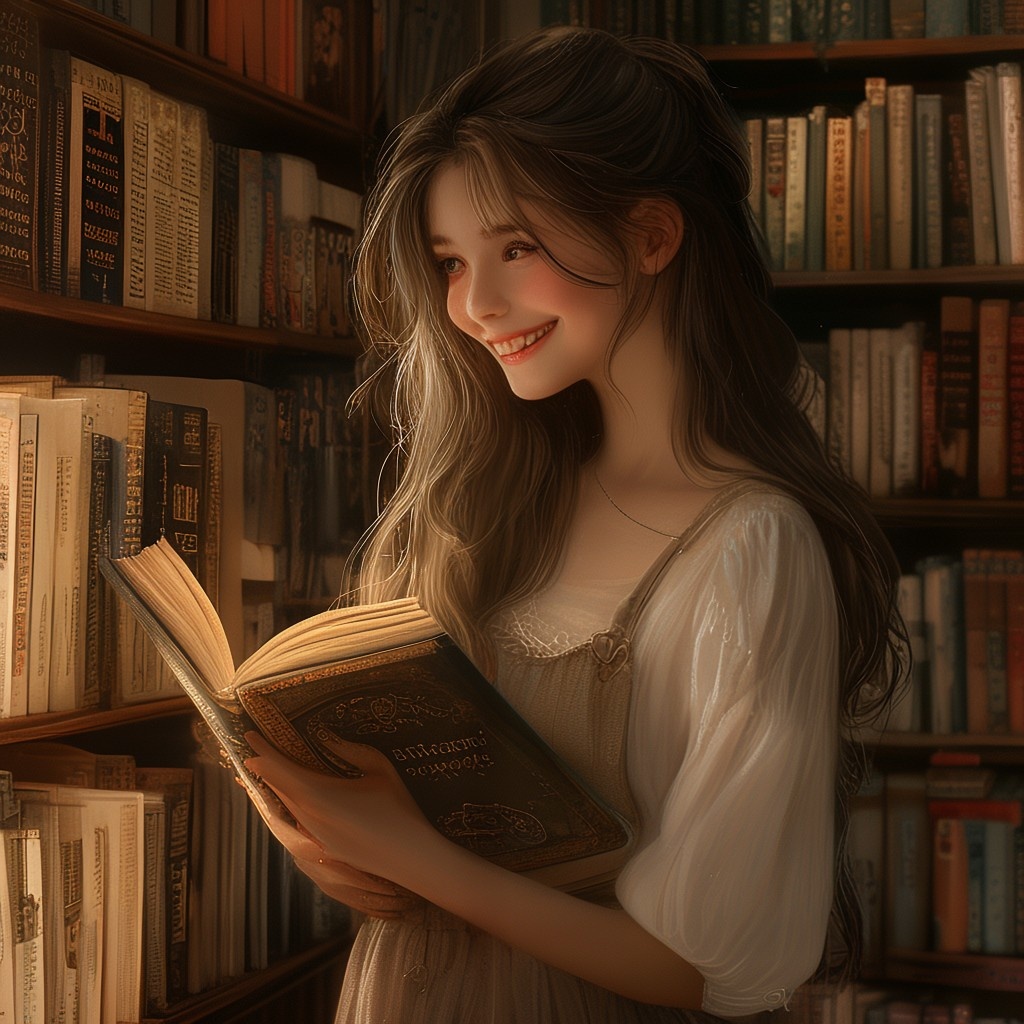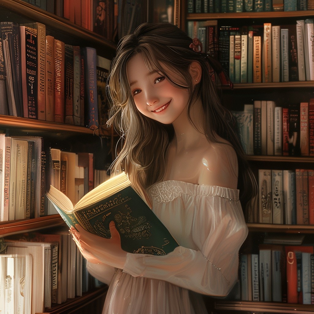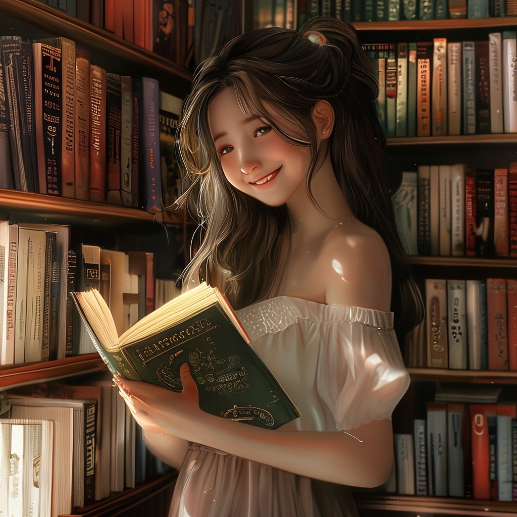 Prompt 1: photorealistic girl in bookshop choosing the book in romantic stories shelf. smiling