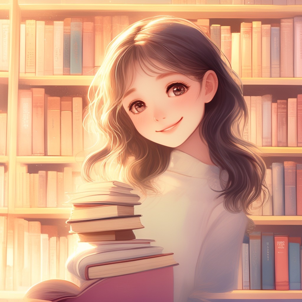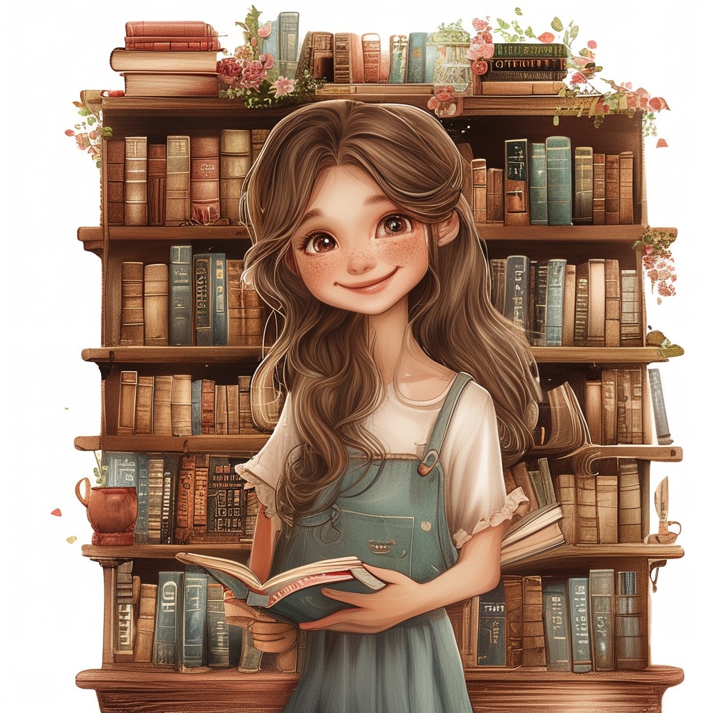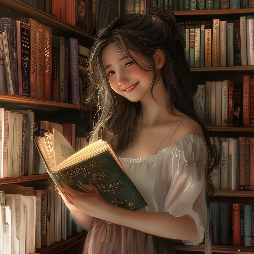 Prompt 1: photorealistic girl in bookshop choosing the book in romantic stories shelf. smiling