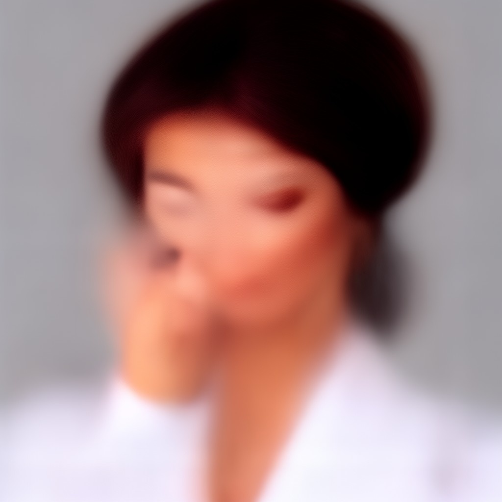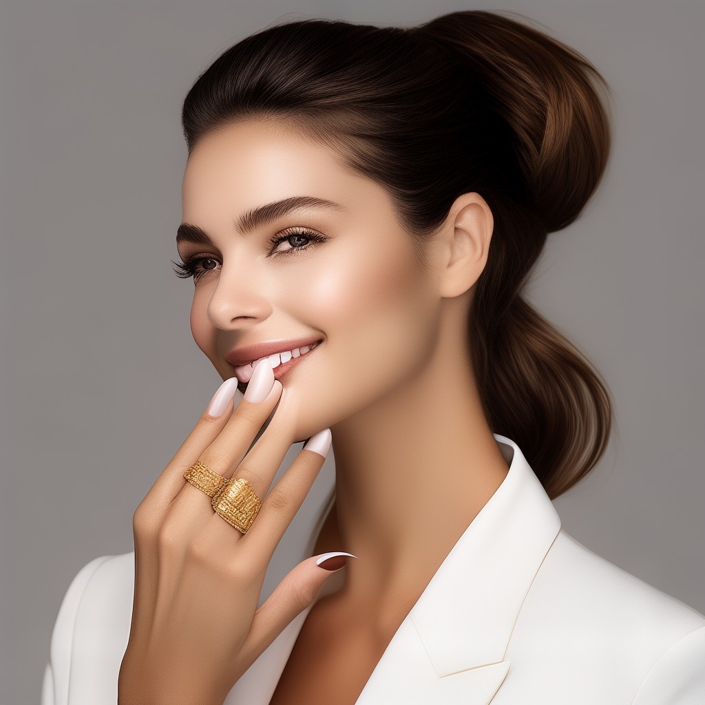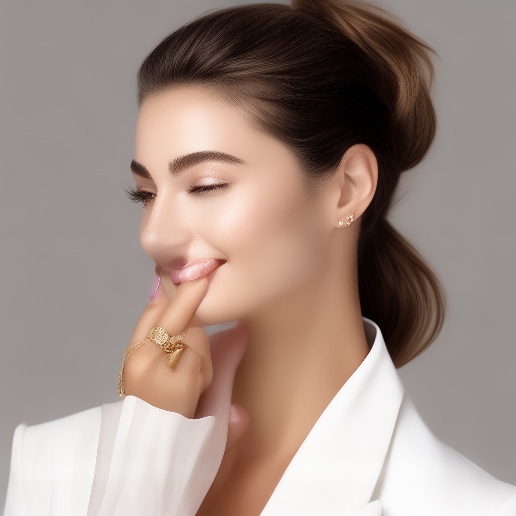 Prompt 2: Create a close-up photograph of a woman's face and hand, with her hand raised to her chin. She is wearing a white blazer and has a gold ring on her finger. Her nails are neatly manicured and her hair is pulled back into a low bun. She is smiling and has a radiant expression on her face. The background is a plain light gray color. The overall mood of the photo is elegant and sophisticated. The photo should have a soft, natural light and a slight warmth to it. The woman's hair is dark brown and pulled back into a low bun, with a few loose strands framing her face.