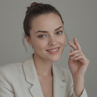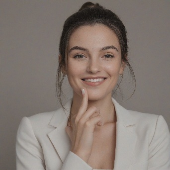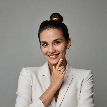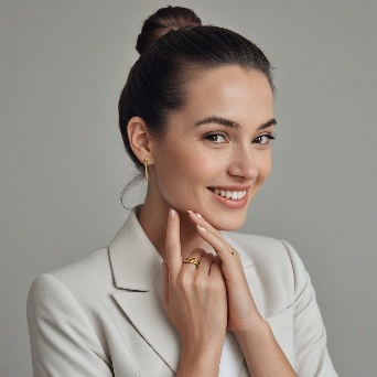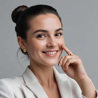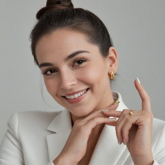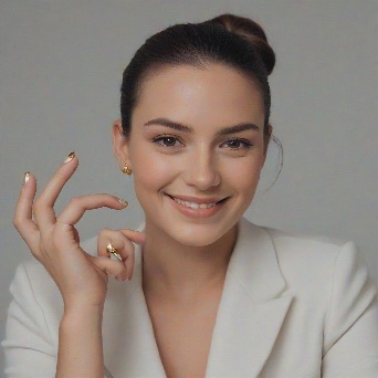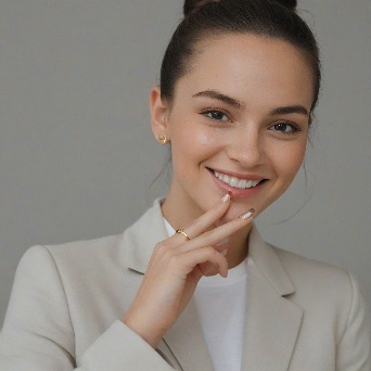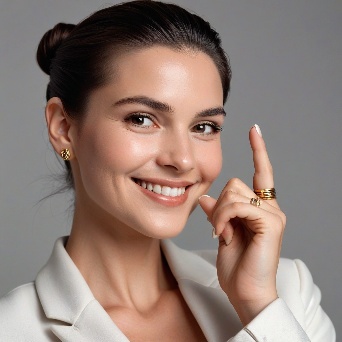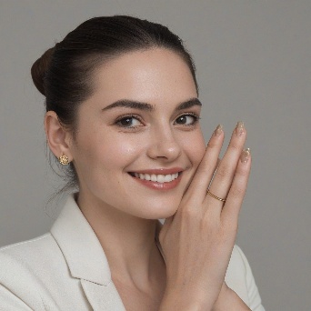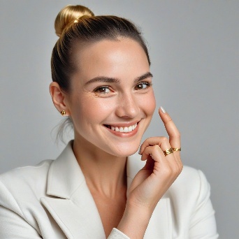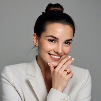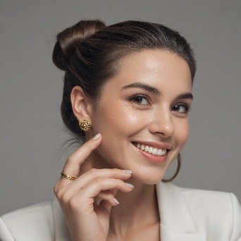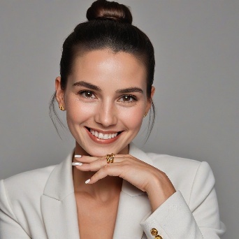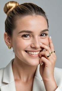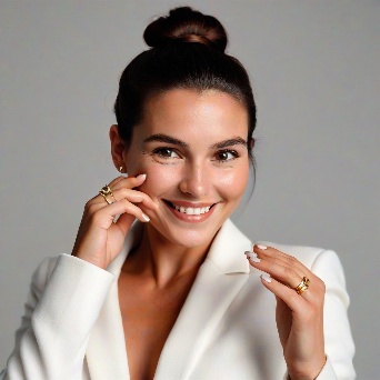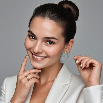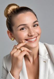 Prompt: Create a close-up photograph of a woman's face and hand, with her hand raised to her chin. She is wearing a white blazer and has a gold ring on her finger. Her nails are neatly manicured and her hair is pulled back into a low bun. She is smiling and has a radiant expression on her face. The background is a plain light gray color. The overall mood of the photo is elegant and sophisticated. The photo should have a soft, natural light and a slight warmth to it. The woman's hair is dark brown and pulled back into a low bun, with a few loose strands framing her face.