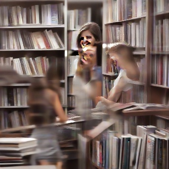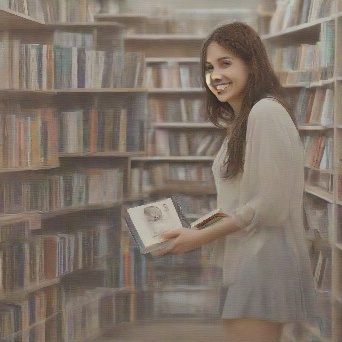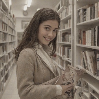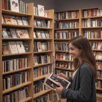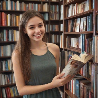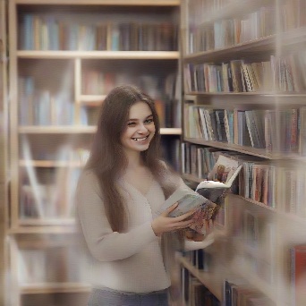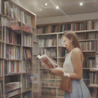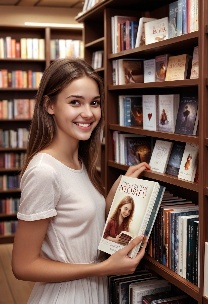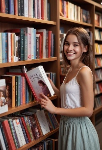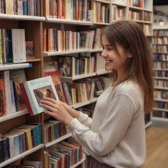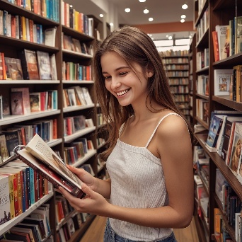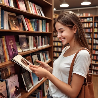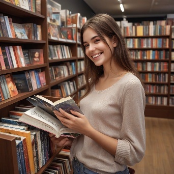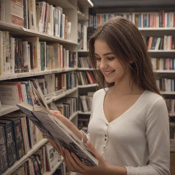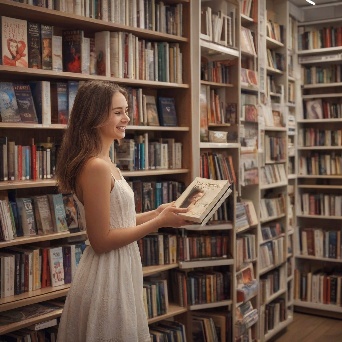 Prompt: photorealistic girl in bookshop choosing the book in romantic stories shelf. smiling