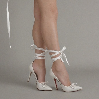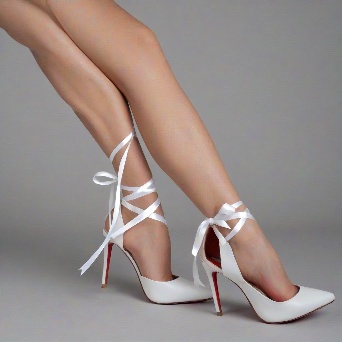 Prompt: Generate a photo of a woman's legs, with her feet crossed and wearing white high-heeled shoes with ribbons tied around her ankles. The shoes should have a pointed toe and a stiletto heel. The woman's legs should be smooth and tanned, with a slight sheen to them. The background should be a light gray color. The photo should be taken from a low angle, looking up at the woman's legs. The ribbons should be tied in a bow shape around the ankles. The shoes should have a red sole. The woman's legs should be slightly bent at the knee.