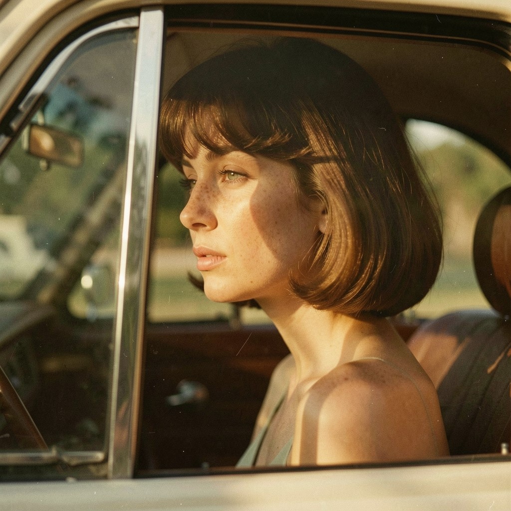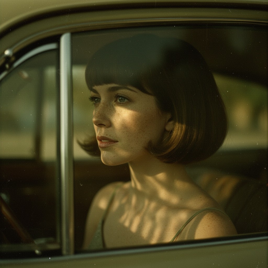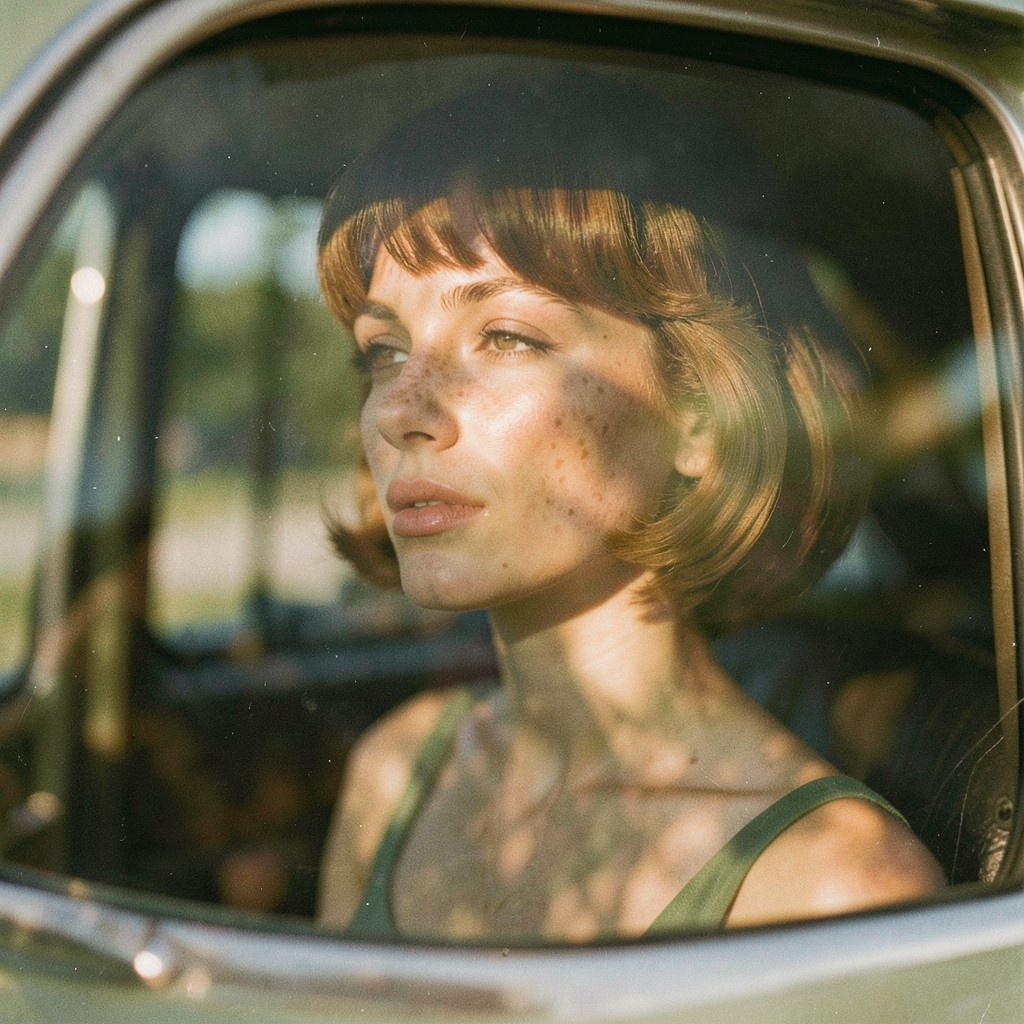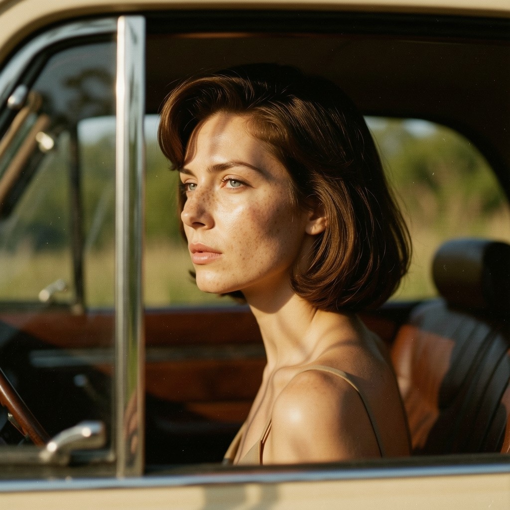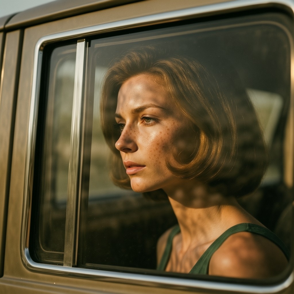 | Reference | Image by Yonashek using Z Image Turbo A cinematic retro analog portrait, wide side view shot of a woman seen through a vintage car window, her face partially obscured by reflections and shadow. She has 1960s haircut style, and thin dress. Shallow depth of field focuses softly on her eyes, while the foreground glass and background dissolve into blur. There is a part of a car's doors visible. Dramatic natural light filters through the window, creating organic patterns of light and shadow across her face, freckles and skin texture emphasized by directional sunlight. Warm, muted color palette with earthy browns, olive greens and soft golden highlights. Strong analog film character: visible grain, subtle color fading, low contrast, dust and micro scratches, gentle softness, slight vignetting. Emotional, introspective mood, quiet tension, cinematic stillness. |
