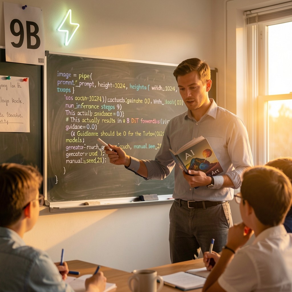 Reference | Image by ms651 using Z Image Turbo A surreal, elegant 1963 European art-house movie poster with minimalist layout, hand-drawn elements, and stark contrasts. The background is a soft, textured off-white like aged paper. Floating near the top in thin, elongated black serif letters: “CITY OF GLASS WINGS” Beneath the title, centered in smaller metallic silver lettering: A tall, dreamlike illustration of Liora Vale dominates the center. She stands on a narrow, impossible staircase made of translucent glass panels suspended in empty space. Her silhouette is slender and ethereal: long blackberry-violet hair falling straight and glossy, catching pale lavender reflections. Her pale amber eyes are half-lidded, distant, reflective—mirroring the surreal cityscape behind her. She wears a flowing, ultramodern 1960s gown of white silk and faint pearlescent panels—clean geometric shapes, sharp angles contrasting with airy transparency. Thin strips of fabric drift behind her like mechanical feathers. Behind her rises the film’s signature image: a floating metropolis composed of crystalline structures, angular towers, and shimmering wings of glass extending outward like a gigantic bird. The city glows with soft blues, teals, and violet highlights, reflecting light in impossible directions. Some buildings appear upside-down, others folding into themselves like origami. Across the lower half of the poster, in vertical black lettering along the left edge: On the right edge, also vertical, in delicate handwritten script: At the bottom, centered in minimalist sans-serif type: Under the credits, in small italic text: Color palette: muted whites, smoky grays, pale blues, soft violets, and subtle silver metallics. The design leans heavily on negative space, thin linework, and surreal geometry. The entire poster radiates quiet, enigmatic beauty—part dream, part architectural puzzle, part emotional cipher. Mood: introspective, otherworldly, elegant, haunting—exactly the kind of poster cinephiles would hang on a gallery wall. | School teacher with chalk in one hand and "AI Art" book in the other hand. Teacher is explaining explaining the code to the class. Blackboard behind him is filled with python code written using chalk. Neon lightning-bolt lamp (⚡️) and pinned A3 paper with large text 6B is on the wall at top left corner. Cinematic light, natural sunset sunlight through the window. photorealistic. The code is image = pipe( prompt=prompt, height=1024, width=1024, num_inference_steps=9, # This actually results in 8 DiT forwards guidance_scale=0.0, # Guidance should be 0 for the Turbo models generator=torch.Generator("cuda").manual_seed(21), ).images[0] Parameters: Steps: 9| Size: 1024x1024| Seed: 21| CFG scale: 1.0| App: SD.Next| Version: 7df6ff7| Pipeline: ZImagePipeline| Operations: txt2img| Model: Z-Image-Turbo | Image by creatumundo399 using Qwen-Image Shot on a Canon EOS 5D Mark IV, professional photography, high resolution, 8k. The photo shows an old factory, it has a large, rusty, bronze-colored metal door, on the doors you can see scratch marks from top to bottom as if many people had been scratching it for a long time with his hands. The front wall is made of stone and you can see how some pieces are missing due to collapses caused by time. The roof is triangular metal, some rusty metal beams are hanging and there are others on the floor covered in dust and sediment. On the wall between the door and the ceiling there is a dirty and half-torn white sign where you can see a worn logo of a letter C with a white polygonal font on top of a black background inside a and and a thick blue hexagonal-shaped border with the points facing up and down. Below the logo you can barely read the word "MAINTENANCE" written in black. In front of the chamber, on the floor, there is a circle with stones and a pile of ashes and old burnt logs in the middle, around it, there is one skeleton, next to the right door, half lying down with the skull fallen to the side, a second skeleton, against the left wall, and has bones around him. On the floor there are some books, a couple of worn and dirty brown leather backpacks, empty glass drink bottles full of dust and sand. On the floor, at bottom right corner, you can also see an old open laptop, full of dust, with a big cable that comes out of the laptop that curves along the floor and gets lost under the metal door. The floor is metal with cracks. In the environment you can see a fine fog that gives a terrifying air to the place. It is night and the environment is only illuminated by the moonlight that enters through the holes in the ceiling. Dust particles can be seen in the air wherever there are rays of light. Negative prompt: cartoon, 3d render, illustration, drawing, painting, blur, low quality, distorted, watermark, signature, ugly, bad anatomy, deformed limbs, fire, Steps: 40, CFG scale: 3.5, Sampler: Euler, Seed: 69797907, Model: qwenImageFp16_fp16, width: 1792, height: 1792, originalSampler: euler |
