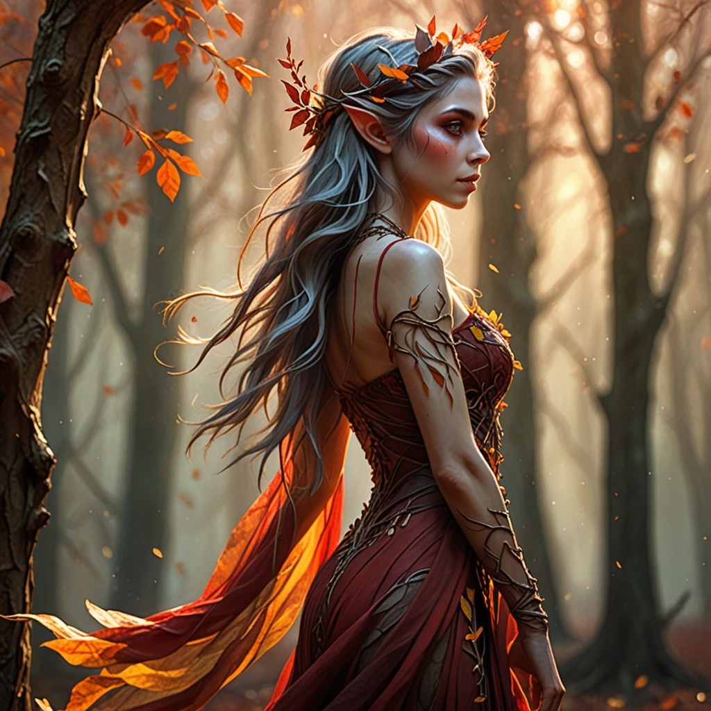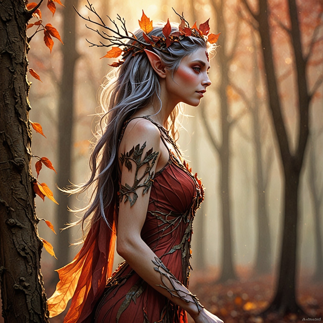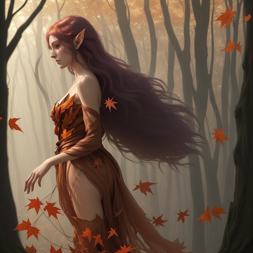 Prompt: VibrantlySharp style, 3pic_vist4, animeniji, in a soft-focus painterly concept art style Upper body profile view, autumn dryad elf adorned in translucent red foliage and bark-textured silk, wind animating her hair and dress into motion, background: ancient twilight forest, distant amber sunlight diffused through fog and drifting leaves. Parameters: Steps: 20| Size: 1280x1280| Sampler: DPM++ 2M SDE| Seed: 2340976655| CFG scale: 3| Model: dreamshaperXL_v21TurboDPMSDE| Model hash: 4496b36d48| App: SD.Next| Version: 87e6d3f| Operations: txt2img| Pipeline: StableDiffusionXLPipeline Time: 33m 17.64s | pipeline 1942.43 decode 52.15 move 3.02 prompt 3.00 preview 2.55 | RAM 27.01 GB 29% |