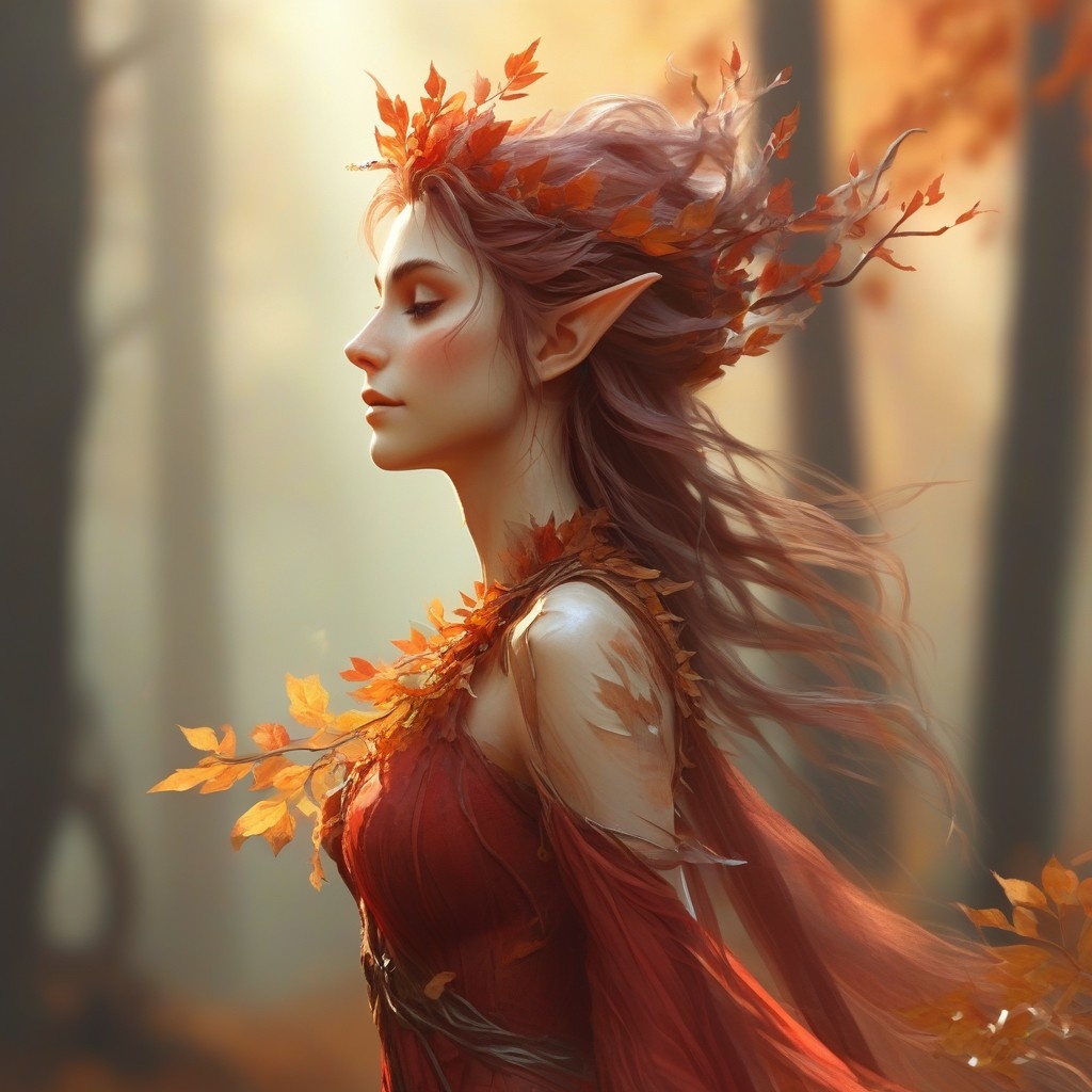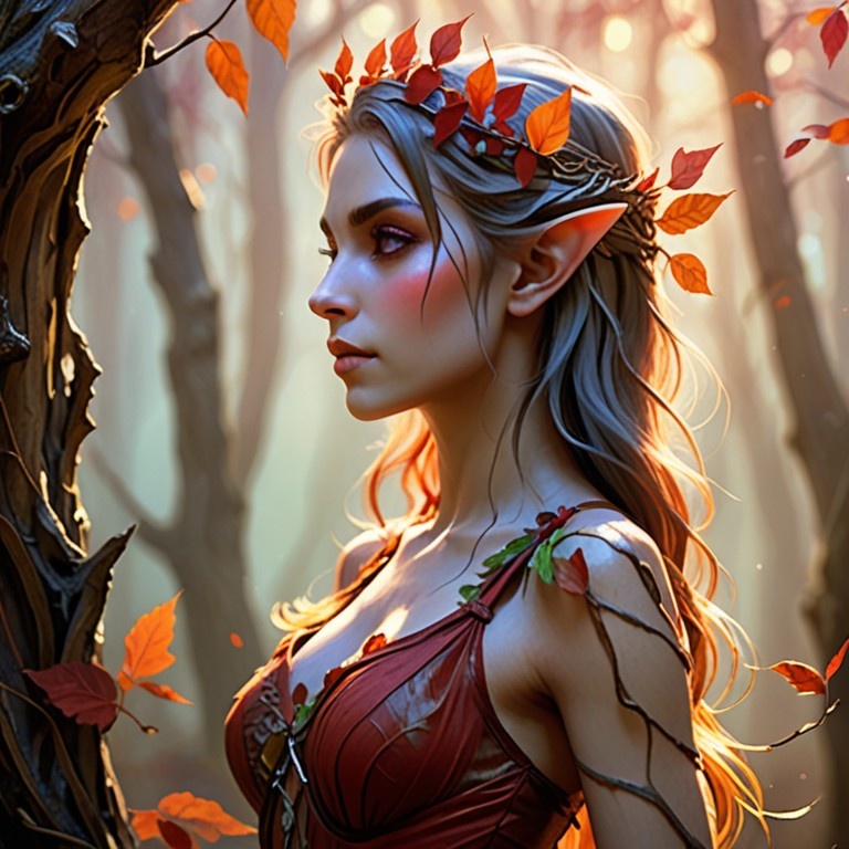 Prompt: VibrantlySharp style, 3pic_vist4, animeniji, in a soft-focus painterly concept art style Upper body profile view, autumn dryad elf adorned in translucent red foliage and bark-textured silk, wind animating her hair and dress into motion, background: ancient twilight forest, distant amber sunlight diffused through fog and drifting leaves. Parameters: Steps: 20| Size: 1280x1280| Sampler: DPM++ 2M SDE| Seed: 2340976655| CFG scale: 3| Model: dreamshaperXL_v21TurboDPMSDE| Model hash: 4496b36d48| App: SD.Next| Version: 72eb013| Operations: txt2img| Pipeline: StableDiffusionXLPipeline Time: 9m 27.69s | pipeline 485.76 decode 81.86 preview 0.41 | RAM 16.11 GB 17% |