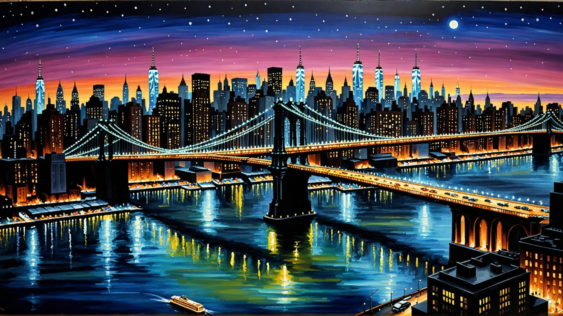dreamshaper_8 CPU | 1920x1080 | Prompt: New York night cityscape with Manhattan bridge. Realistic masterpiece painting Negative: watermarks, text, signature Parameters: Steps: 20| Size: 1920x1080| Sampler: DPM++ 2M SDE| Seed: 501711785| CFG scale: 6| Model: dreamshaper_8| Model hash: 879db523c3| App: SD.Next| Version: 87e6d3f| Operations: txt2img| Pipeline: StableDiffusionPipeline Execution: Time: 42m 26.46s | pipeline 2477.11 decode 69.30 preview 0.65 | RAM 12.24 GB 13% |