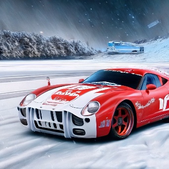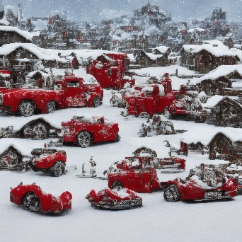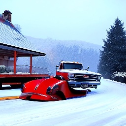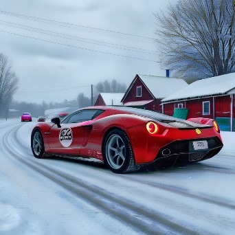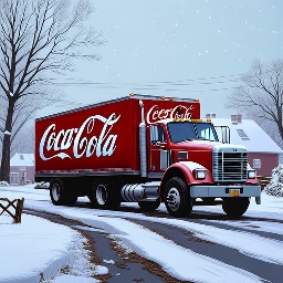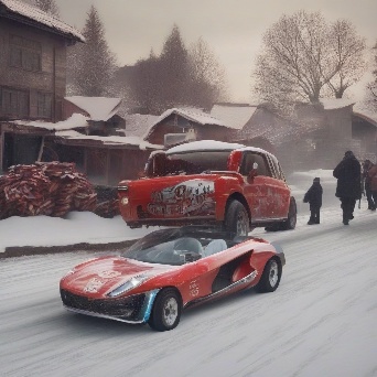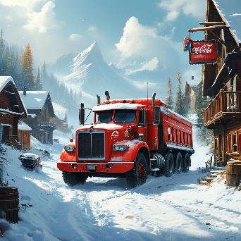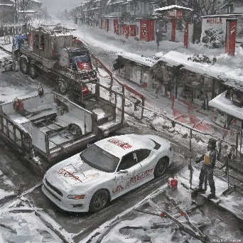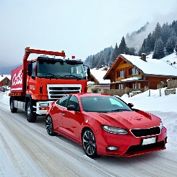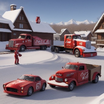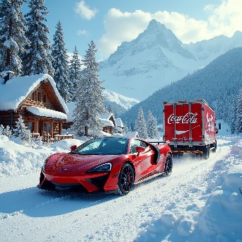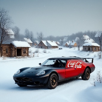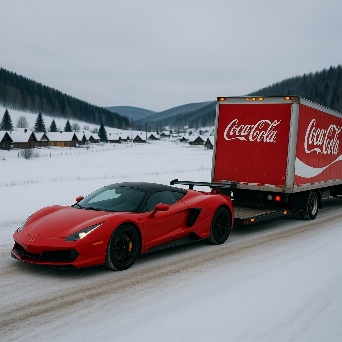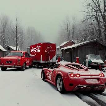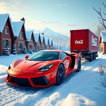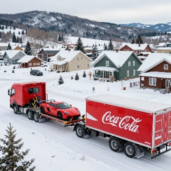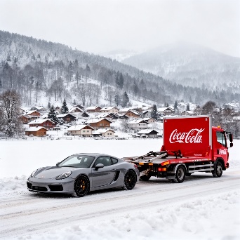Sports car in faraway winter village get towed by coca-cola truck