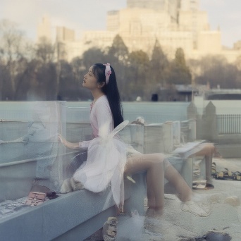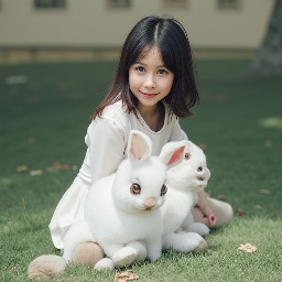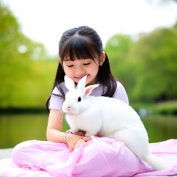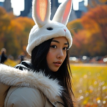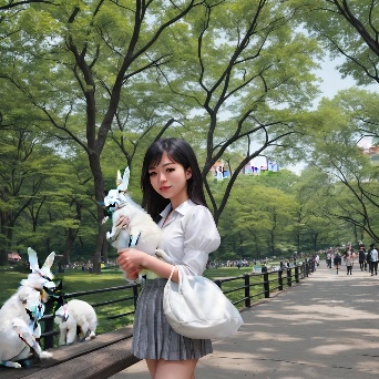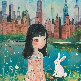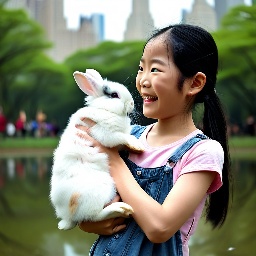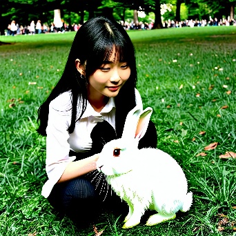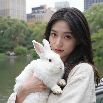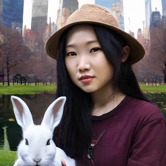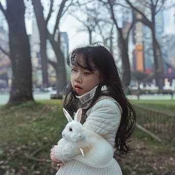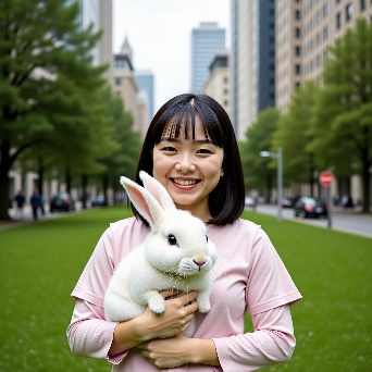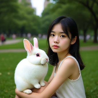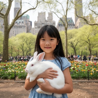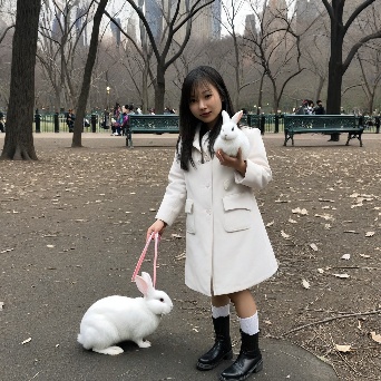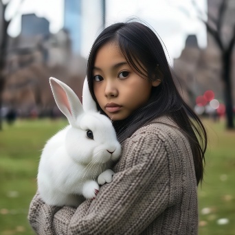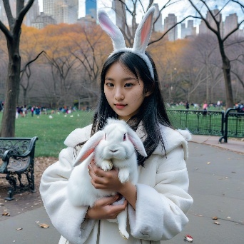 Asian girl with white rabbit in New York Central Park