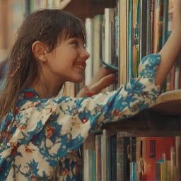 Prompt: photorealistic girl in bookshop choosing the book in romantic stories shelf. smiling