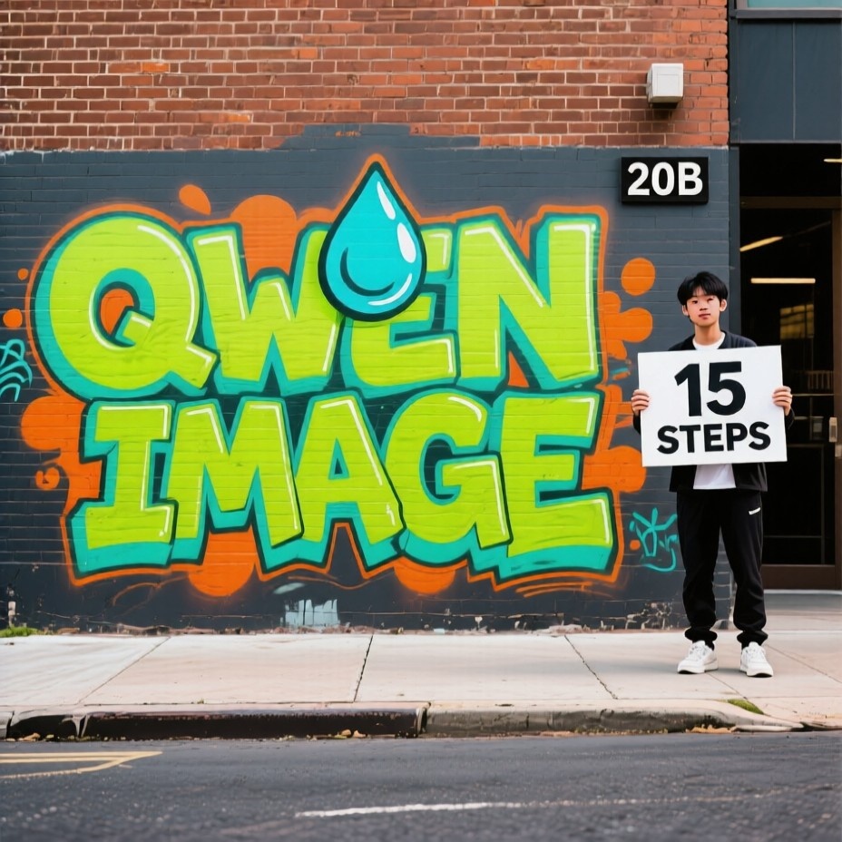 Prompt: Brick wall with bright "QWEN IMAGE" graffiti .With water drop sign behind the text. Graffiti main colors are Lime and Mint with some minor orange accents. Dark grey asphalt on a sidewalk below. Building number sign with text "20B" upper left side the graffiti. Young Asian holding in both hands a sign "15 STEPS" at the right. Parameters: Steps: 15| Size: 928x928| Seed: 1045811524| CFG scale: 3.6| CFG true: 3.6| App: SD.Next| Version: d01dc11| Pipeline: QwenImagePipeline| Operations: txt2img| Model: Qwen-Image-Distill-Full Time: 9m 16.27s | total 712.99 pipeline 556.24 callback 86.75 preview 67.27 te 1.94 vae 0.73 | GPU 59846 MB 50% | RAM 3.97 GB 3% |
