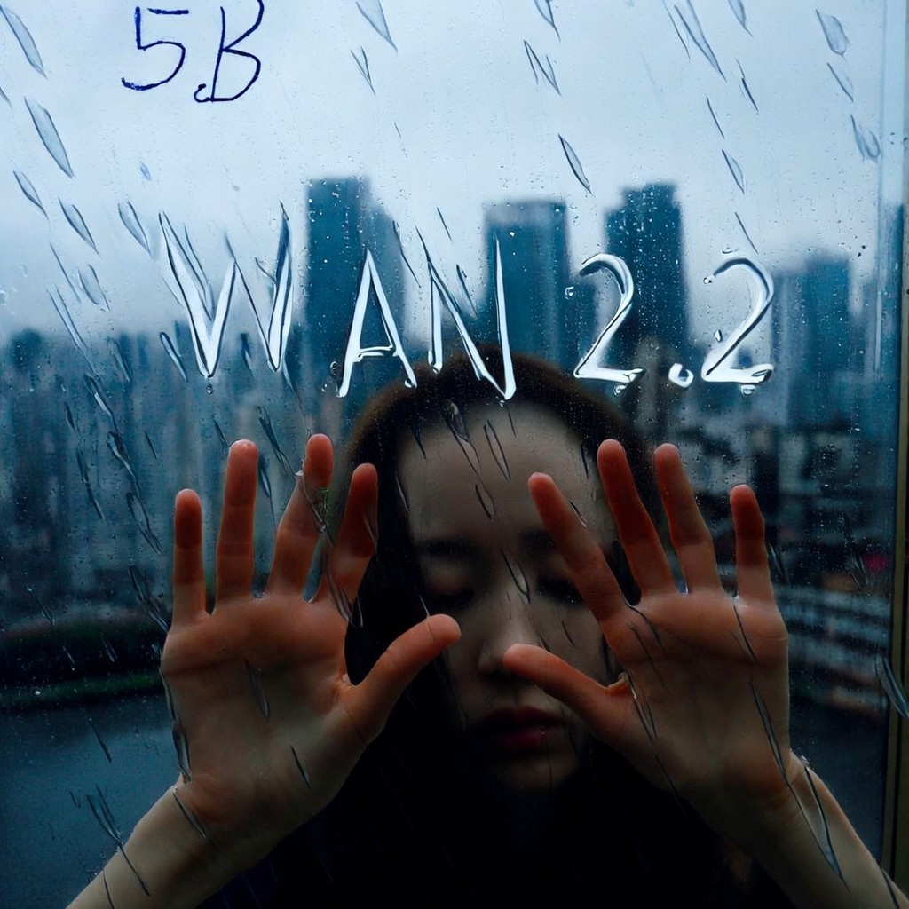 Prompt: A close-up scene showing the text WAN 2.2 meticulously formed by a womans fingers pressed against the outer surface of a rainy windowpane. The letters are created using individual raindrops that gather and slide along the glass, forming clear, sharp characters with slight reflections. The woman’s face is partially blurred at the edges, visible only faintly through the wet glass—her features soft and indistinct, eyes downcast, hair damp and clinging to her shoulders. Behind the window, a dense urban skyline stretches into the distance, featuring towering skyscrapers with reflective surfaces catching the dim twilight glow; fog curls around some buildings, adding depth and atmospheric haze. In the upper-left corner of the composition, written in loose, uneven cursive handwriting in faded blue ink, the number 5B appears subtly beneath the edge of the frame. Rain streaks cascade diagonally across the glass, enhancing texture and motion, creating a sense of quiet intensity and isolation within the city.