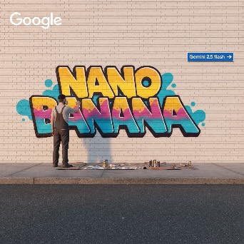 Prompt: Young man doing final spray to finish a bright graffiti "NANO BANANA" on a clean brick wall. Dark grey asphalt on a sidewalk below. Company name "Google" is on the top left corner above the graffiti. large direction sign with text "Gemini 2.5 flash" is on the right from graffiti