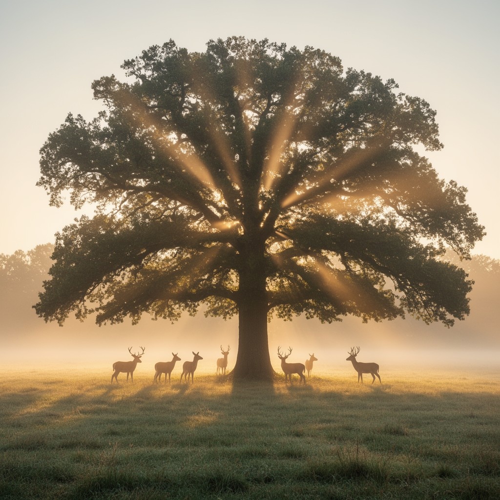 | Reference | Prompt: A majestic ancient oak tree standing alone in an open meadow at sunrise, its wide canopy filling the frame. Warm golden sunlight streams through the dense leaves, creating dramatic sun rays and god rays in soft morning mist. Several deer stand calmly beneath and around the tree, partially silhouetted by the light. The ground is covered in dewy grass with gentle fog hovering near the surface. Cinematic, tranquil, and ethereal atmosphere, soft haze, natural colors, high dynamic range, ultra-detailed, realistic nature photography, shallow depth of field, volumetric lighting, rule of thirds composition, peaceful wildlife scene. Parameters: Steps: 50| Size: 1024x1024| Seed: 42| CFG scale: 4| App: SD.Next| Version: a84ddc3| Pipeline: Flux2Pipeline| Operations: txt2img| Model: FLUX.2-dev |